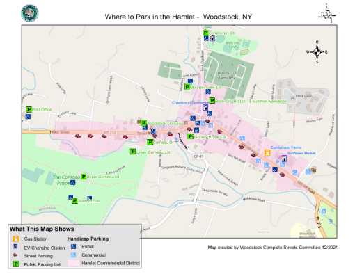 Please consult the Parking Map for locations of parking lots, handicapped parking, the gas station, and electric care charging stations. There are no meters, but the parking lot on the East side of Rock City Road charges by the day on weekends during the summer season (exact dates vary).